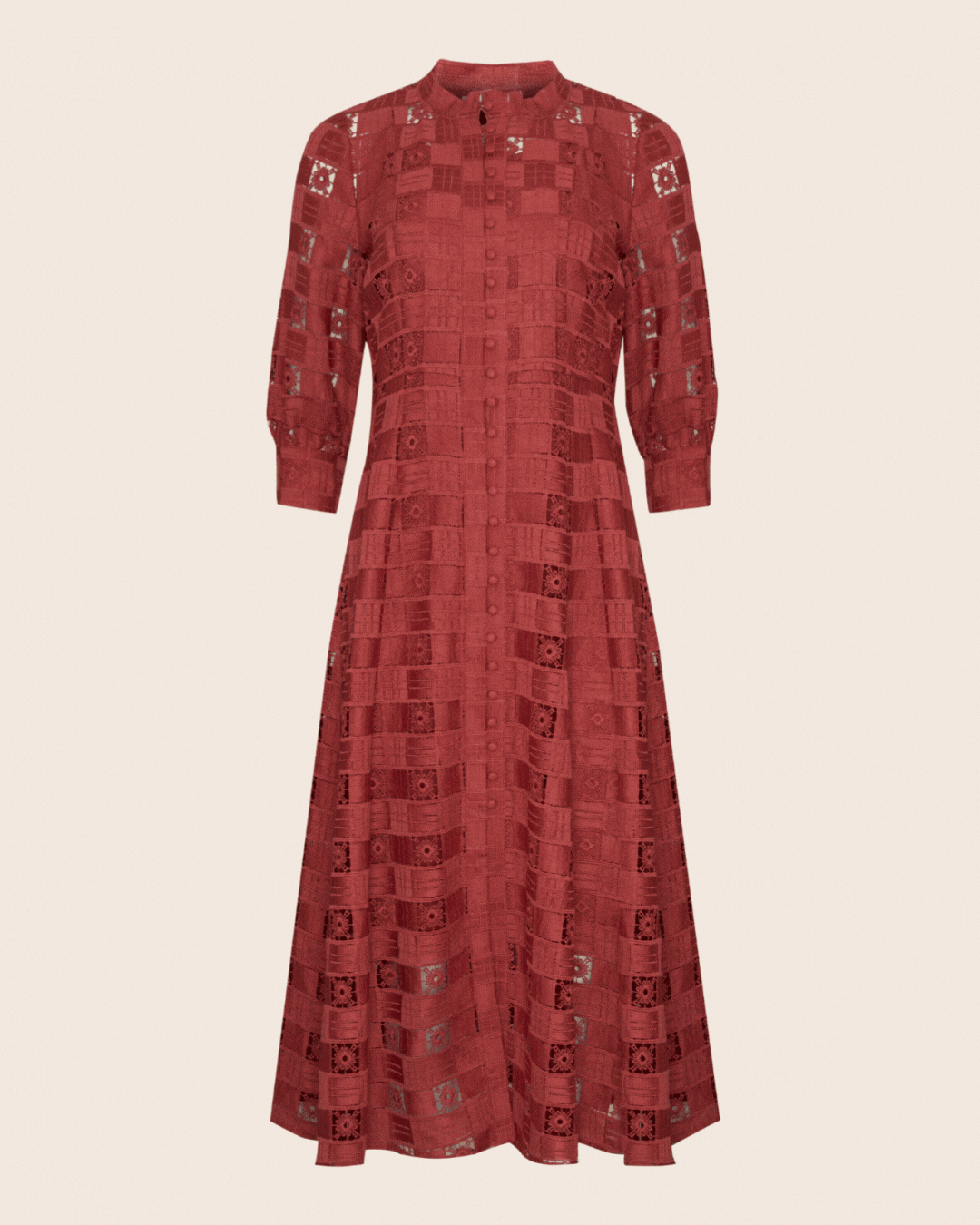 the beguile dress, available in fire, cream, and clay, embodies romantic sophistication. crafted in intricate lace with covered buttons and softly blouson sleeves, this midi-length silhouette is both graceful and modern, making it a standout wedding guest outfit for day-to-night dressing. whether you opt for the bold fire red, the soft femininity of cream, or the earthy warmth of clay, this dress promises effortless elegance for any wedding celebration.