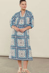 side splits add ease to the midi length of the aurora dress, while the bespoke print makes it a true seasonal highlight. refined and versatile, it is a piece designed to be worn and remembered. a European-inspired motif in white, navy, and sapphire, celebrating colour, movement, and vibrance.