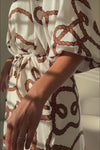 the bravura maxi is shaped by feminine details and fluid lines, delivering striking elegance in a bespoke print. milk chocolate and black combine in this stunning rope motif print. On a slight off white base this print is both contemporary and timeless. a nod to the seas and the adventures if offers.