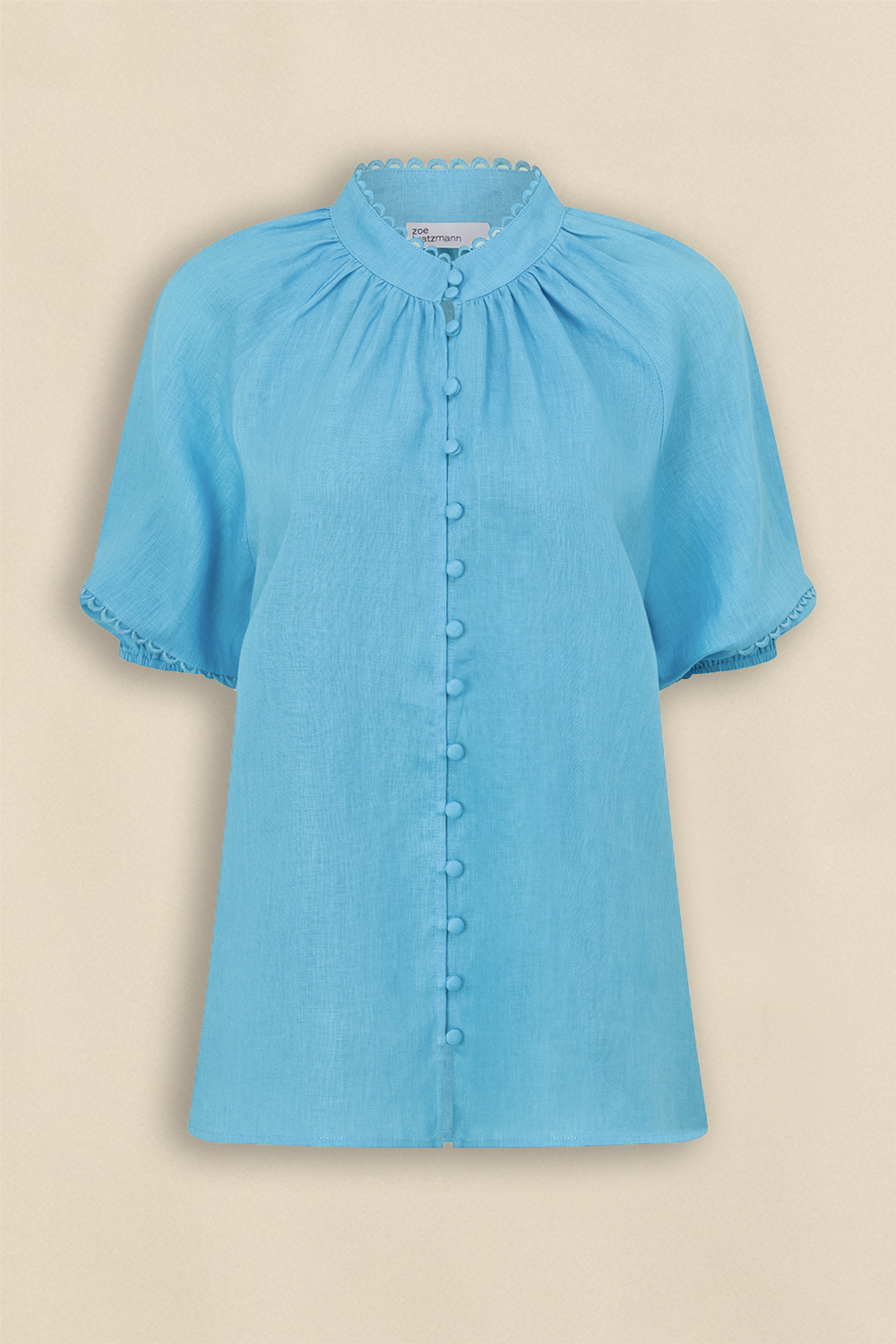 the drift is defined by its high neck-stand and softly gathered raglan sleeves, finished with elasticated cuffs for subtle shape. scalloped trims bring feminine detail, while an elevated button-up front ensures versatility. refined and timeless, it’s a wardrobe staple designed to endure.