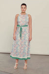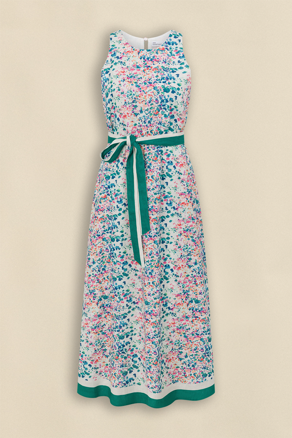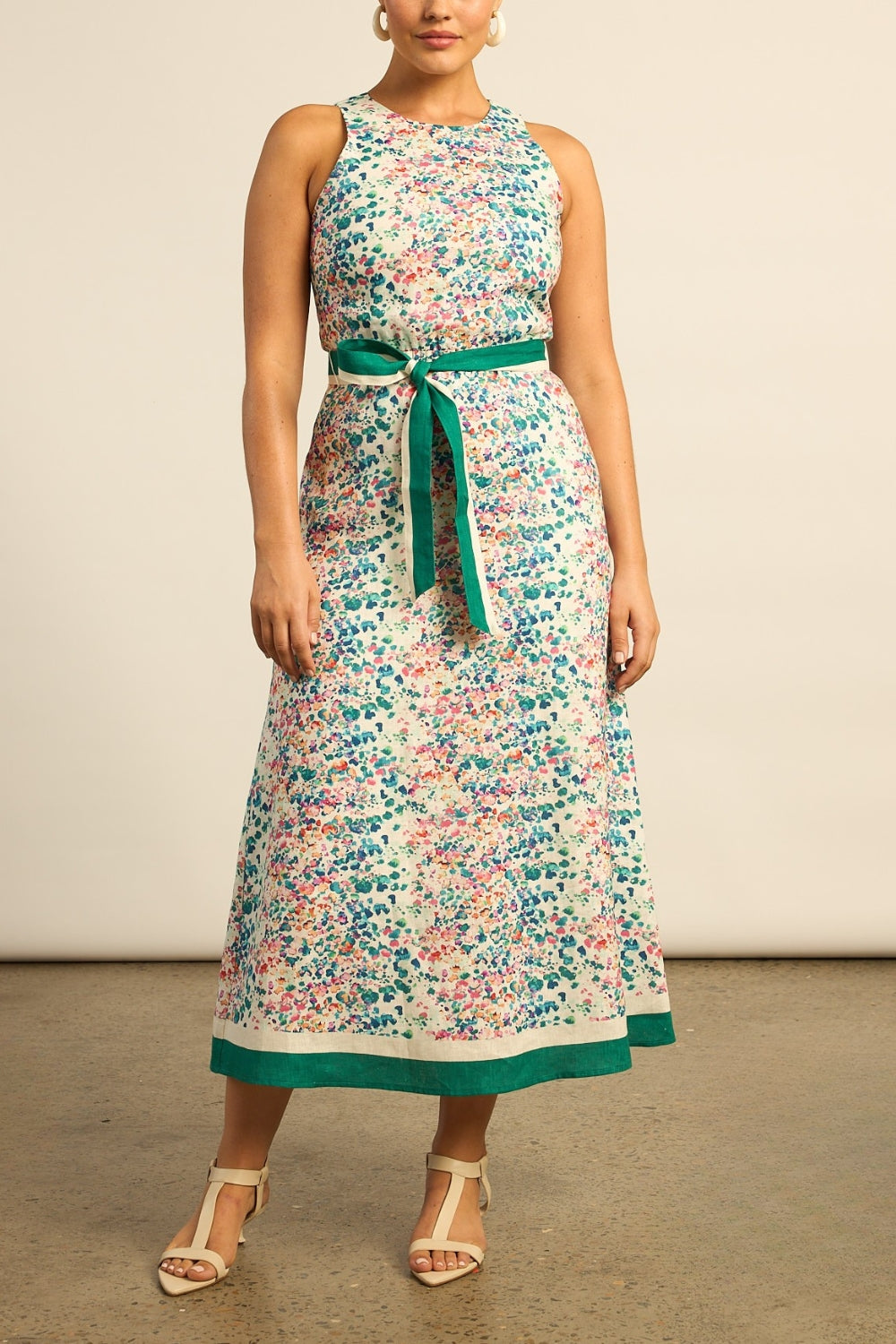 the dusk dress is shaped with a high rounded neckline and sleeveless fit-and-flare profile. a waist seam with a self-tie belt refines the shape, while a midi length adds polish to everyday outfitting. finished with an invisible zip and covered button closure at the back, it’s a modern piece designed for versatility.