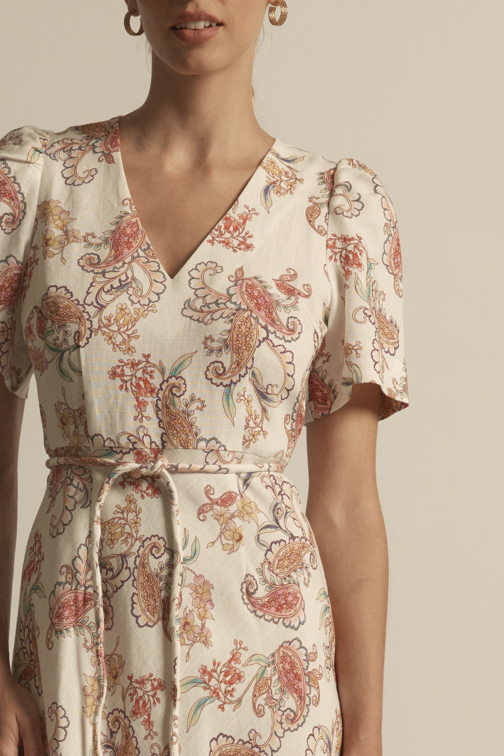 crafted in a linen blend, the fable offers a flattering v-neckline, leasing into an elegant bias cut skirt that creates movement and effortless elegance.