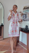 the forum tunic dress balances structure and softness. the petal mirage print offers fresh dimension, while brass domed buttons and a crisp collar anchor the design. the result is a versatile piece for relaxed daywear to resort styling with ease. watermelon, pink and orange hue’s create a striking and eye-catching combination in petal mirage. a nod to vintage charm, organic paisley motifs are treated as a contemporary flair.