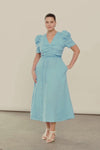 crafted in linen, the glimmer dress features a flattering v neckline with front gathers leading into a softly gathered blouson sleeve. An A line skirt creates soft movement and balances perfectly with the more fitted and defined bodice.