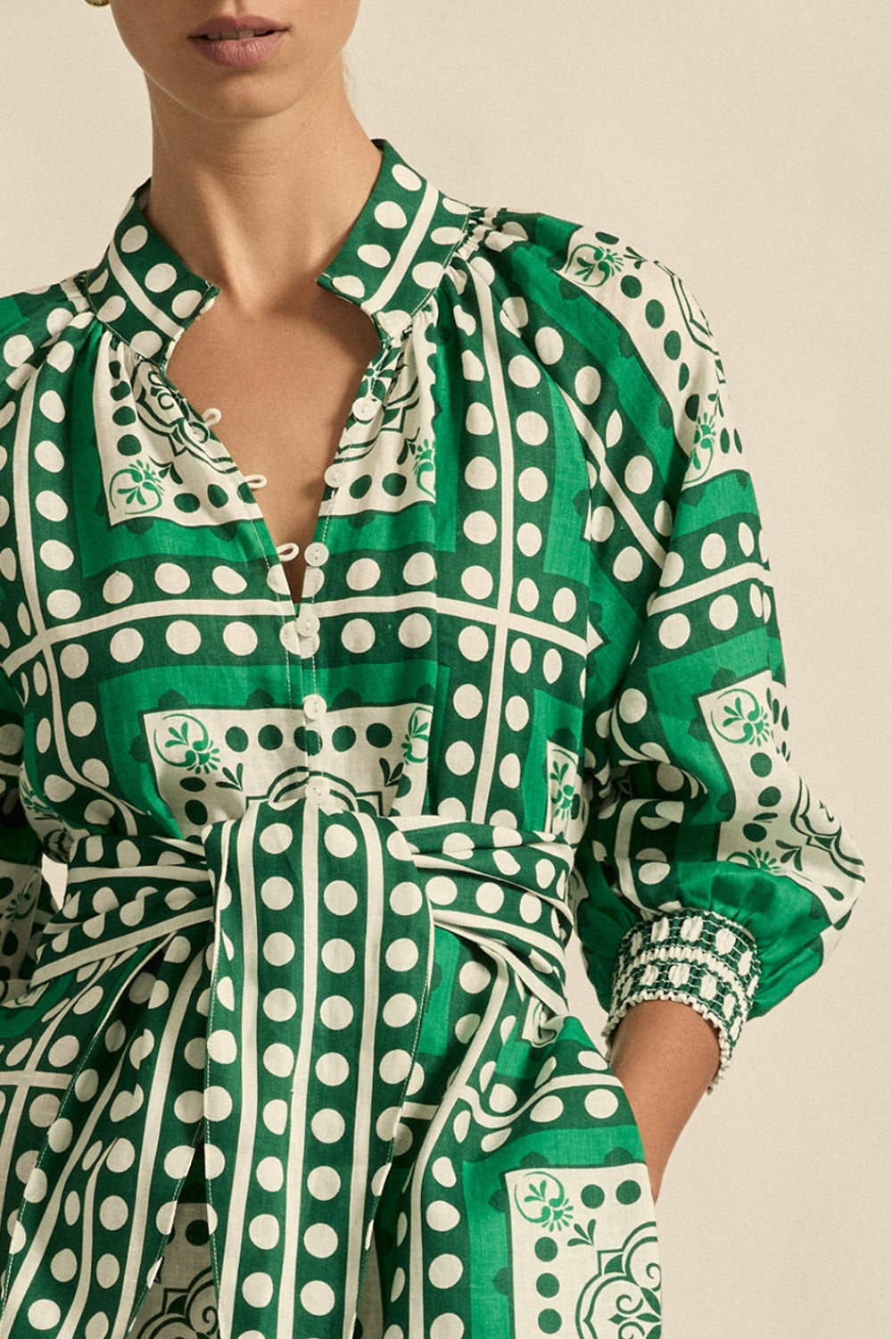 sustainably printed our exclusive parrot scarf print, a spirited exploration of hue and european-inspired graphic motif. crafted in pure linen, it's ideal for warm weather and versatile wear.