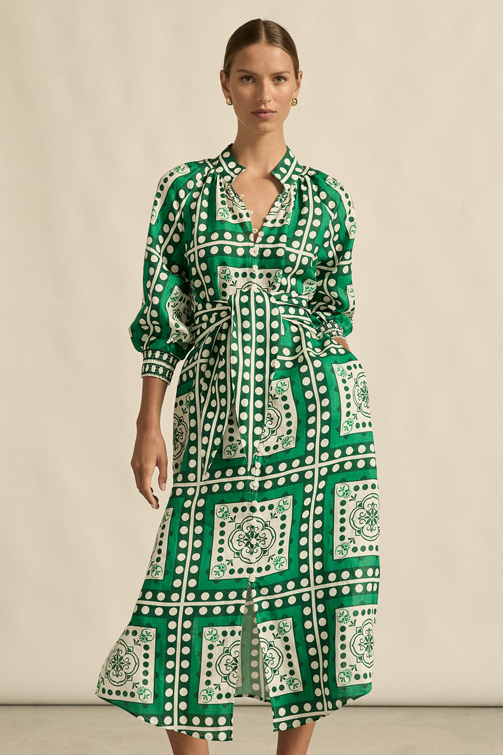 the flourish dress brings elevated ease to everyday moments. crafted in the zk exclusive parrot scarf design, perfect for print-led outfitting. see product details below.