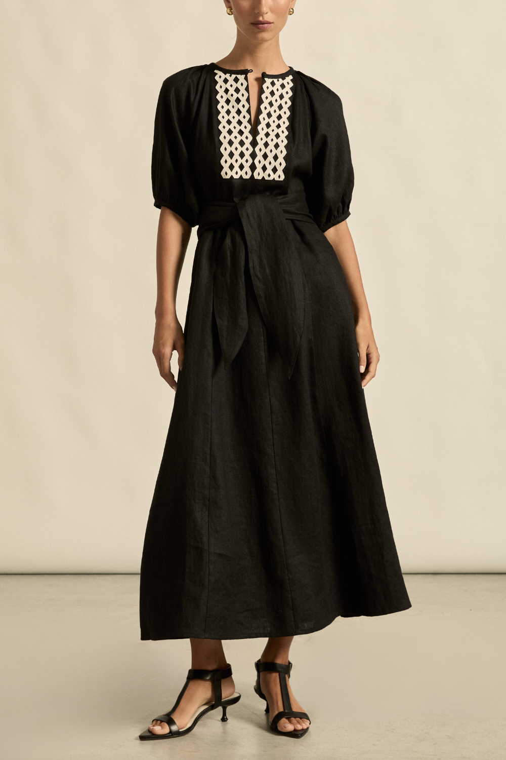 an ode to organic textures and quiet femininity, the harvest dress evokes resort-wear ease through soft linen, bib lace detailing, and subtle gathering. see product details below.