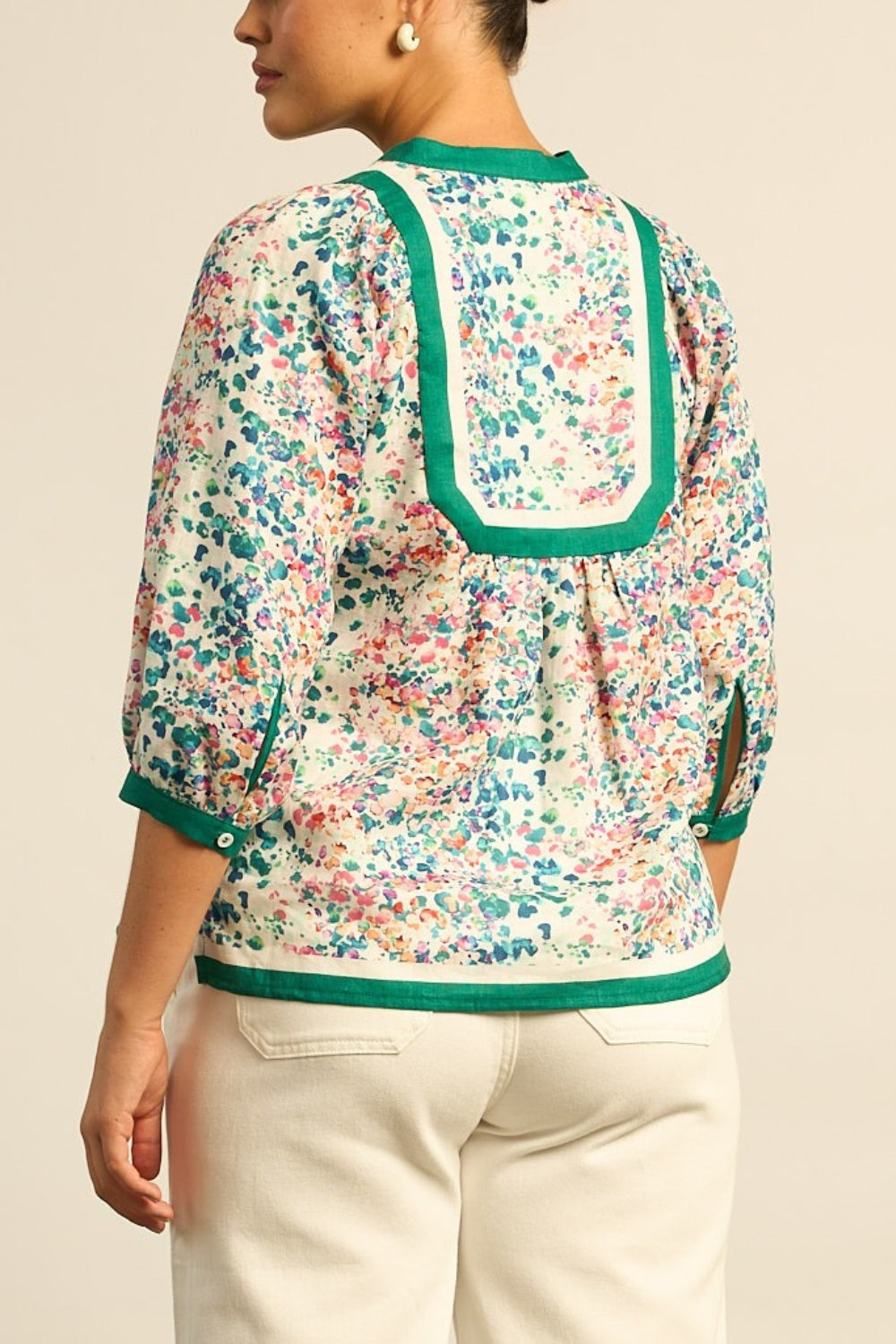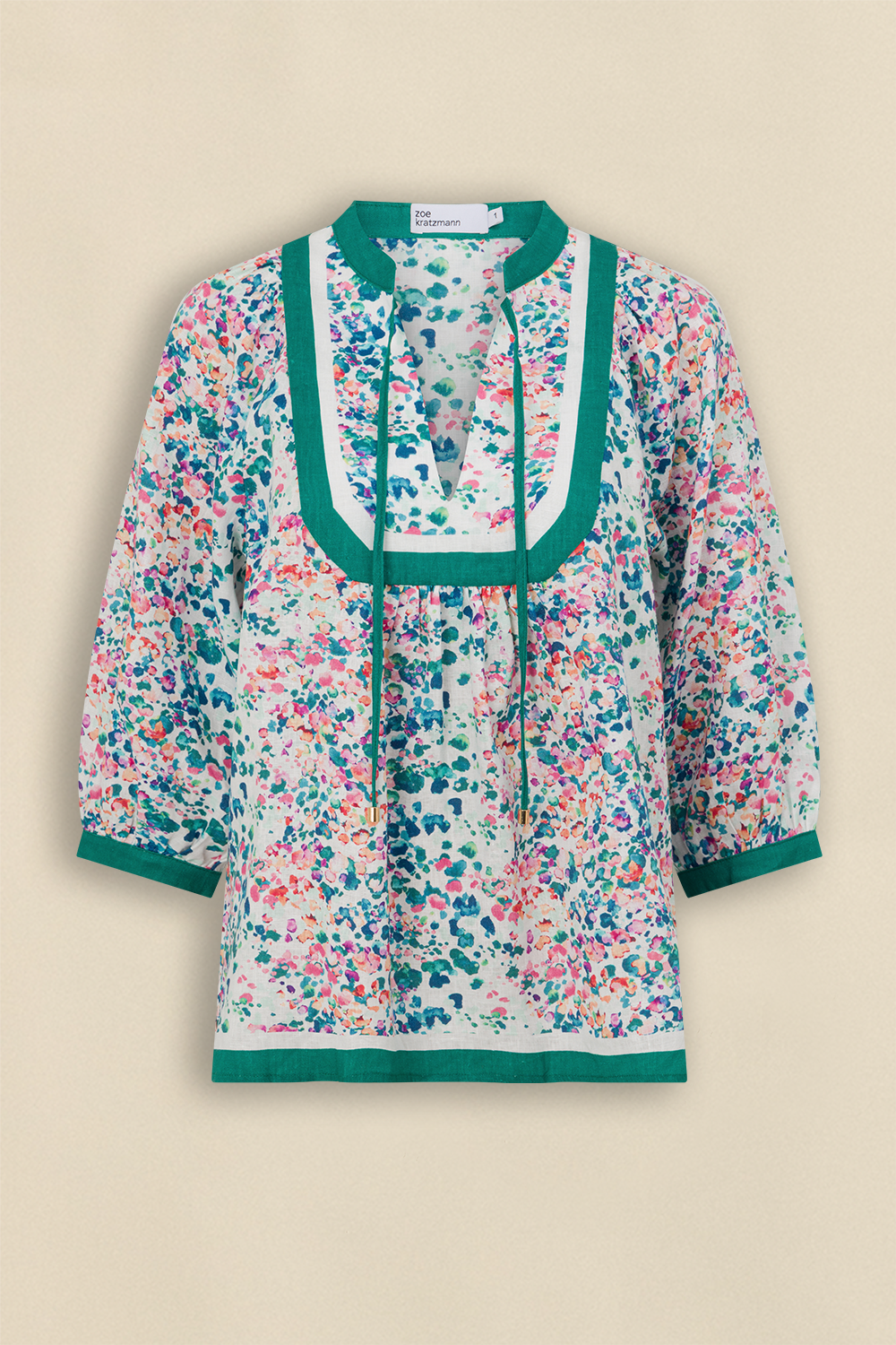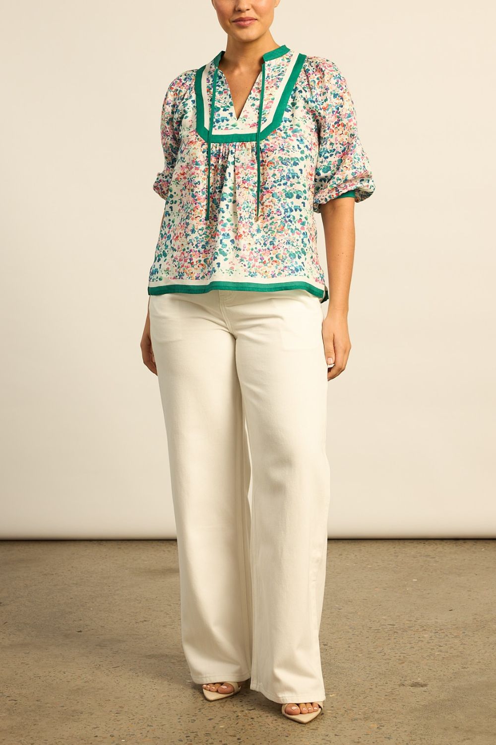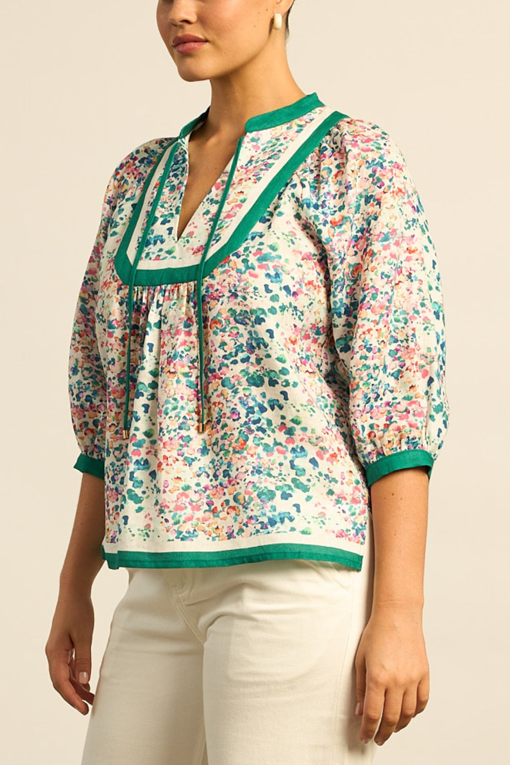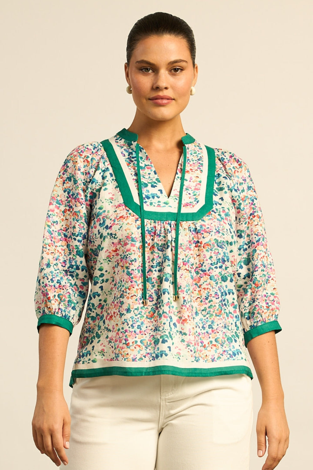 the haven top pairs a bold print with considered detailing. a contrast bib frames the feminine v neckline, finished with a self-tie for versatile styling. elbow-length raglan sleeves add comfort, while side splits ensure movement. relaxed in fit and refined in finish, it’s an elevated everyday piece.