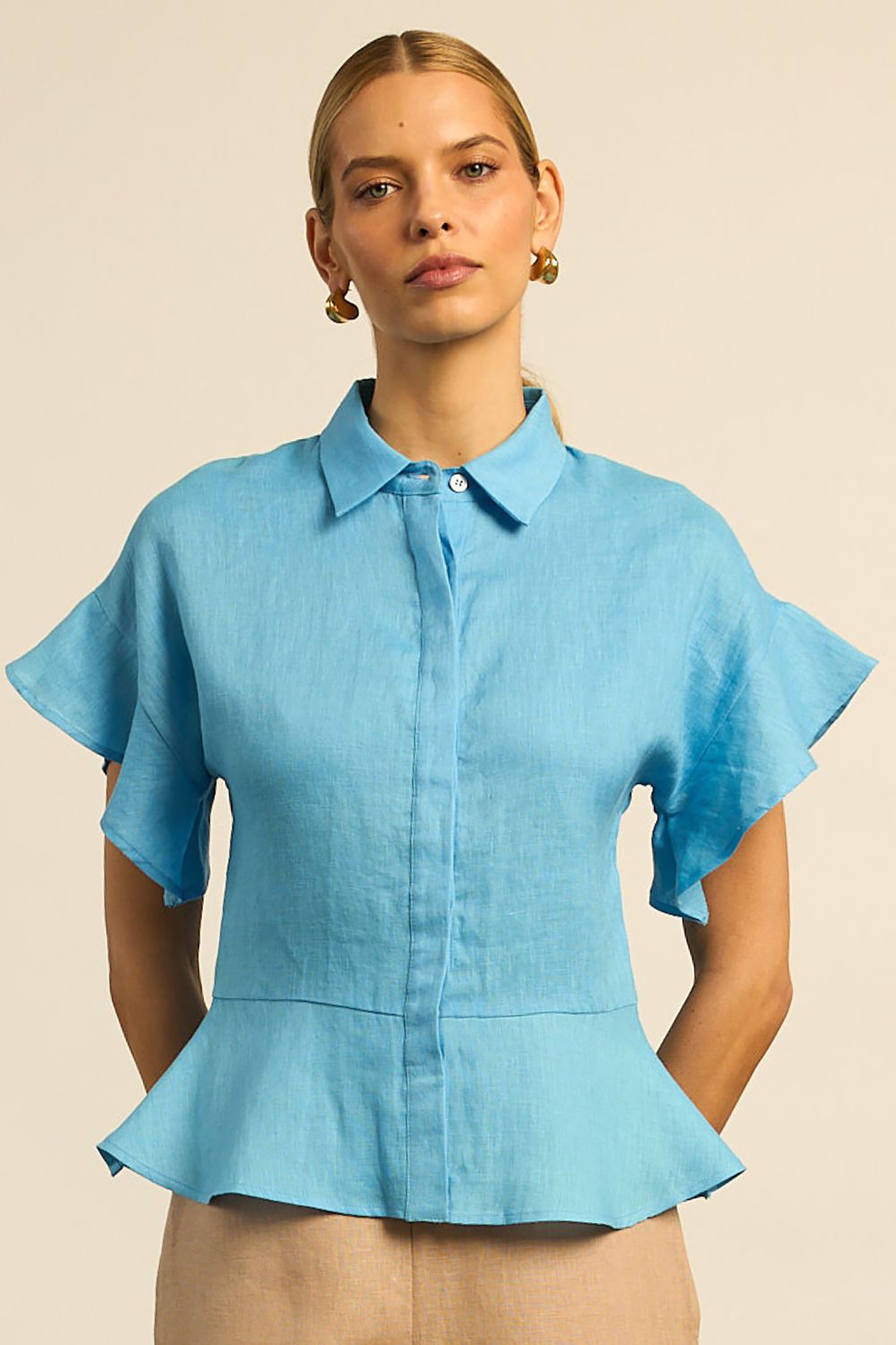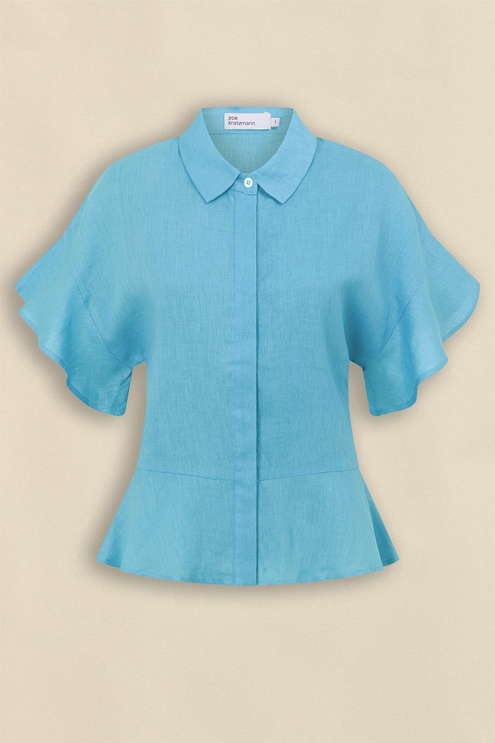 featuring dramatic flutter sleeves and a semi structured peplum shape. porcelain shell buttons are concealed beneath a covered placket, keeping the focus on proportion. contemporary yet highly wearable, it’s a versatile piece designed for elevated everyday dressing.