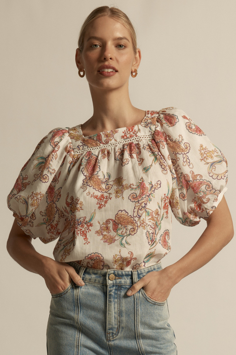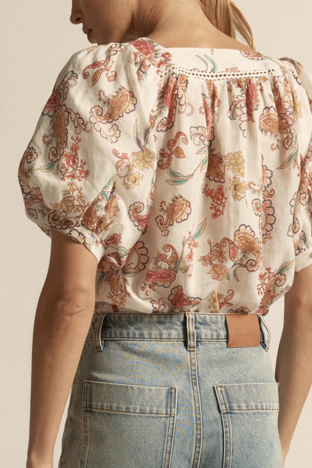 a relaxed silhouette with delicate trims, the ode top offers femininity with versatility. An array of pinks, lilac's, washed reds, and ochre combine in this energised and feminine print. The detailing of paisley and floral motifs speak to spring and beyond.