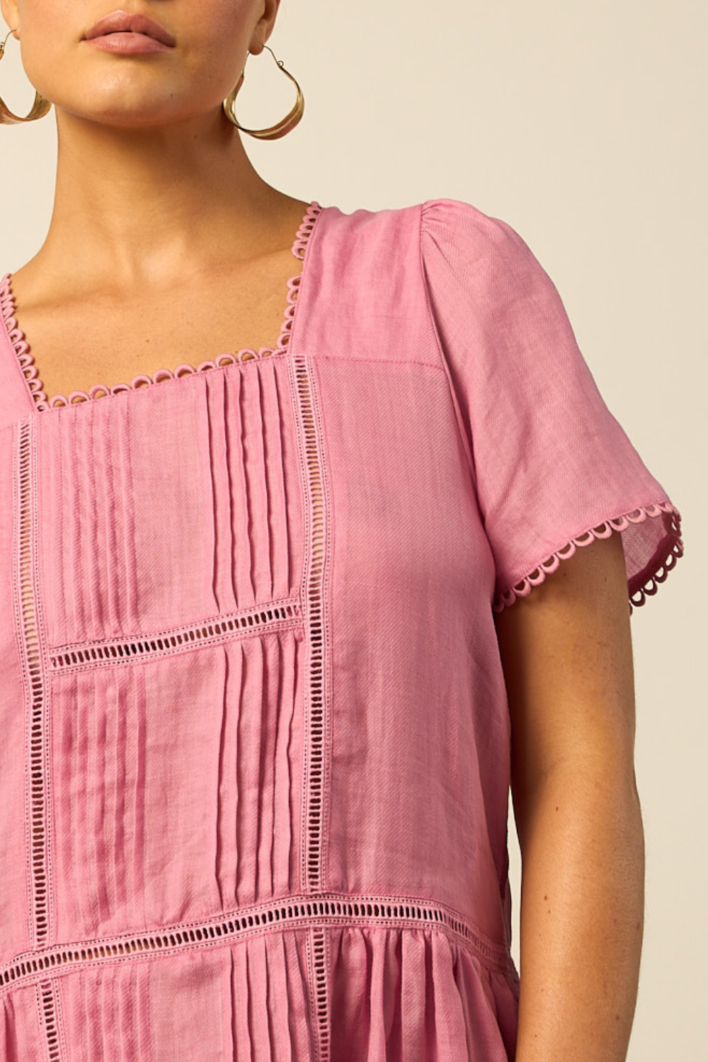 - square neckline finished with scalloped lace trims