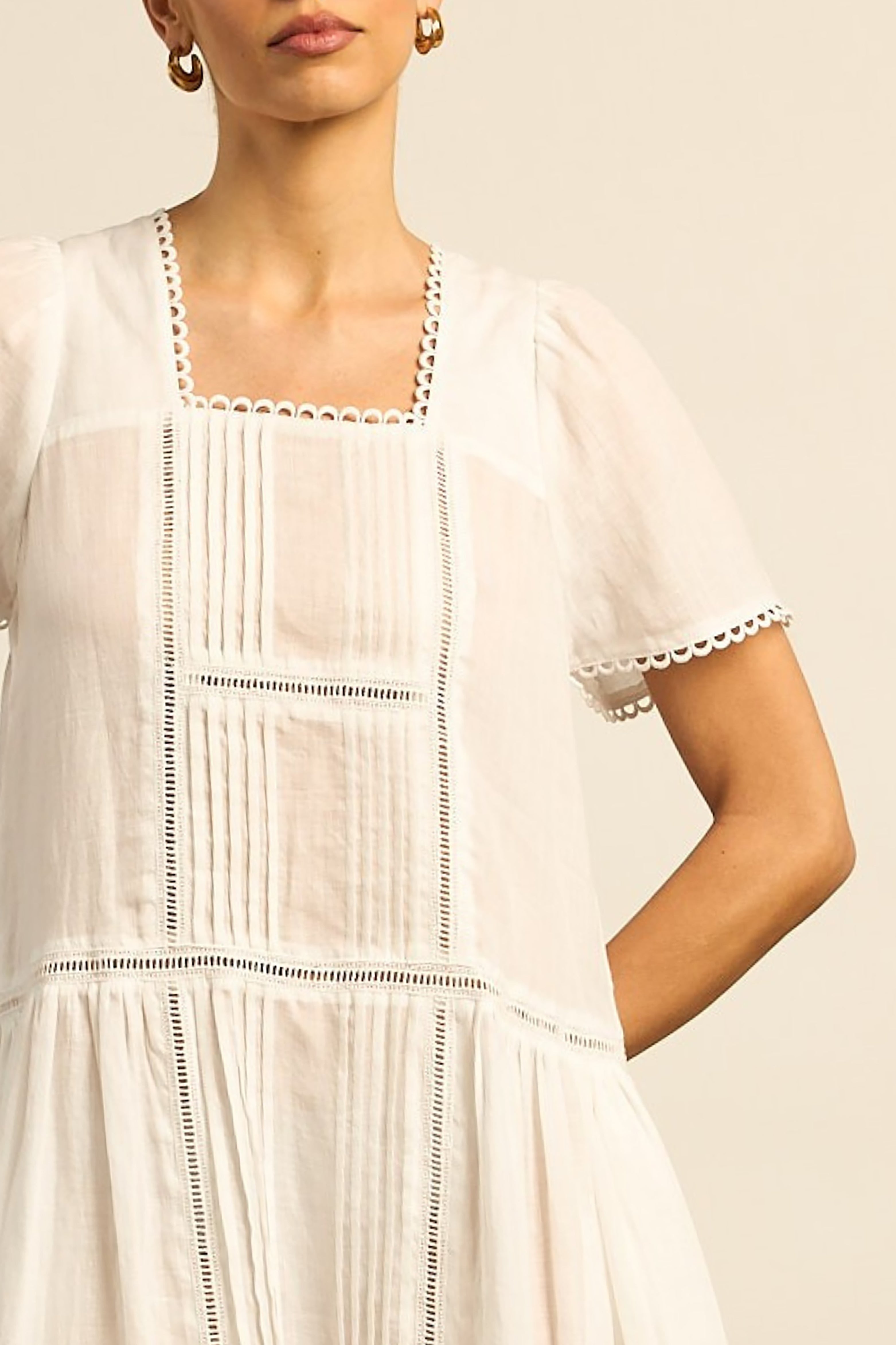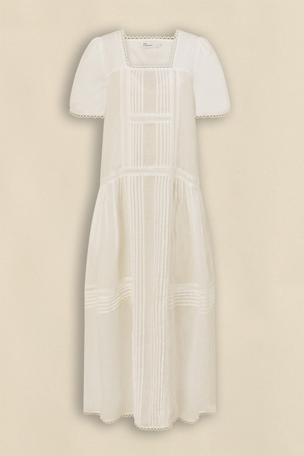 the skyscape dress offers ease and fluidity. a square neckline is finished with lace trims, while pin tuck detailing and ladder-lace inserts create subtle dimension. the drop waist flows into gentle gathers, complemented by softly shaped sleeves. elegant and versatile, this dress is designed as a relaxed yet elevated staple for the modern wardrobe.