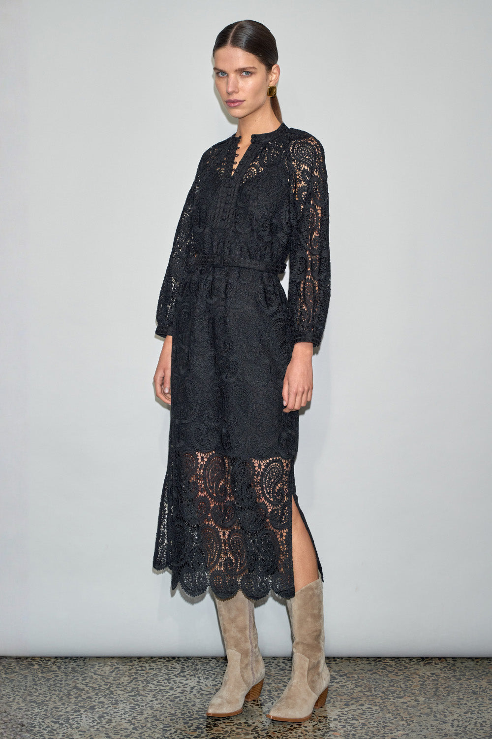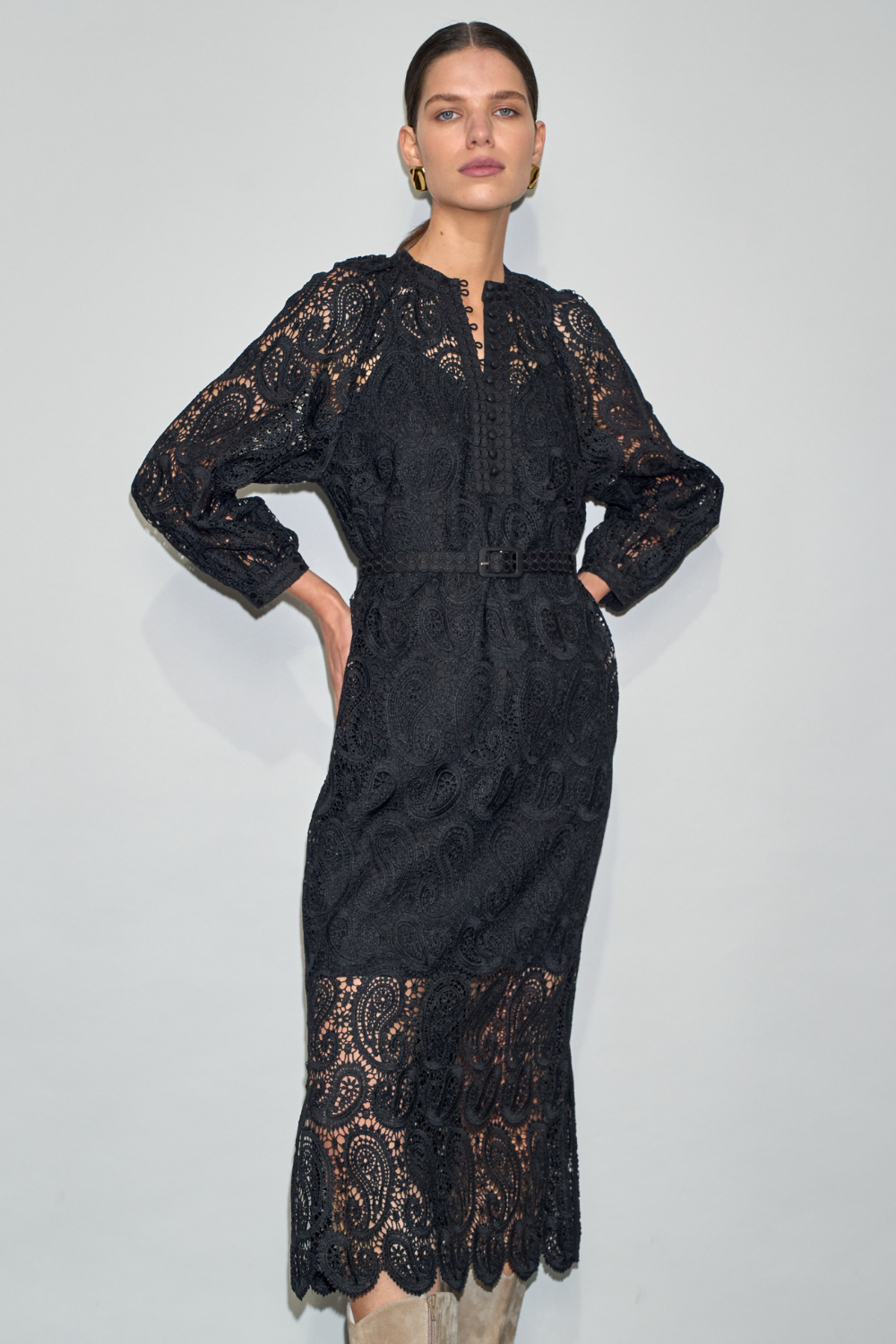 a raglan sleeve creates a soft shoulder line, while the belt allows for adjustable waist shaping. linen buttons through the bodice bring a subtle textural contrast to the lace.