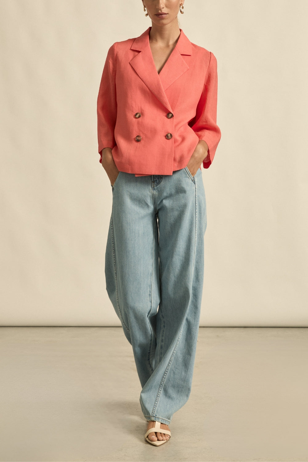 off-the-body comfort, while angular lapels and a double-breasted front create a refined edge.