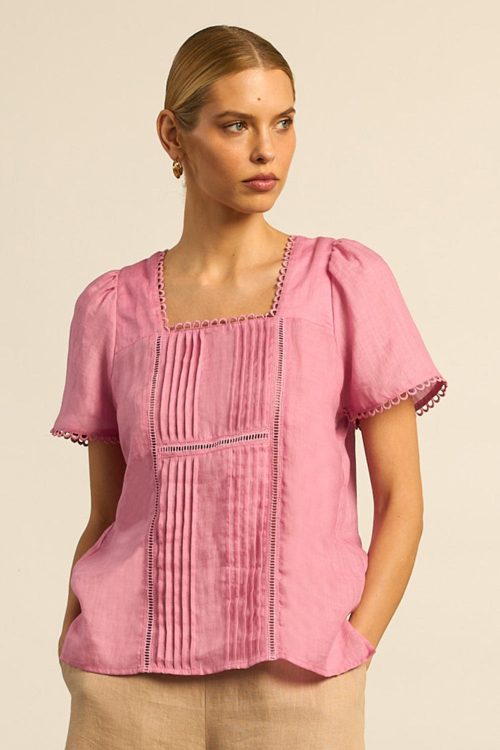 shaped with a feminine square neckline, finished with scalloped lace trims. Pin tucks and ladder-lace inserts create subtle structure, while gathering at the shoulders lends soft volume through the sleeves. relaxed yet refined, it’s a versatile piece designed for elevated everyday wear.